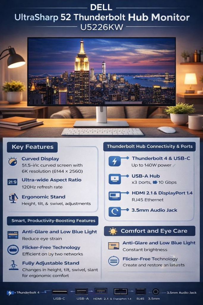 The Dell UltraSharp 52 Thunderbolt Hub Monitor – U5226KW arrives as a standout choice for professionals seeking a workspace that supports multitasking without compromise. With its giant curved screen, rich connectivity, and outstanding performance, it reimagines what a monitor can do in today’s demanding environment.