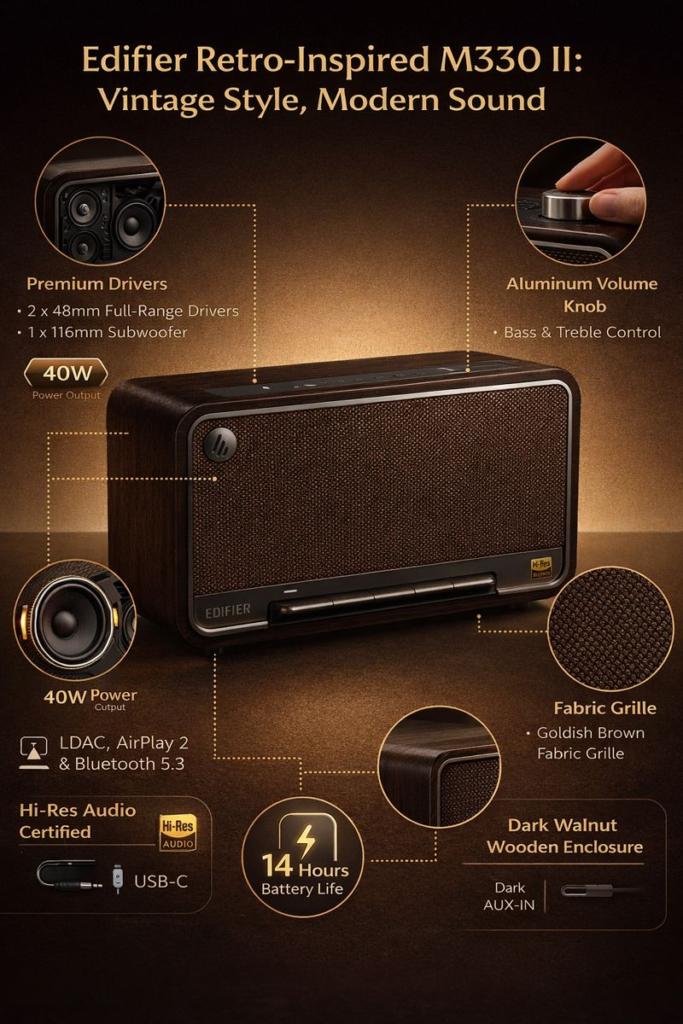 The Edifier retro-inspired M330 II succeeds because it doesn’t try to do everything. Instead, it focuses on delivering excellent sound, premium wireless features, and a design that stands out without shouting. It’s a speaker built for listening, not just noise.