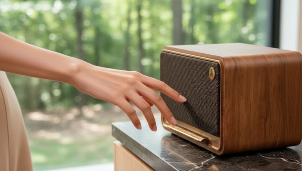 Despite its retro appearance, the build quality feels thoroughly modern. The materials feel sturdy, the finish is refined, and the speaker is clearly designed to sit proudly on a desk, shelf, or side table without looking out of place.