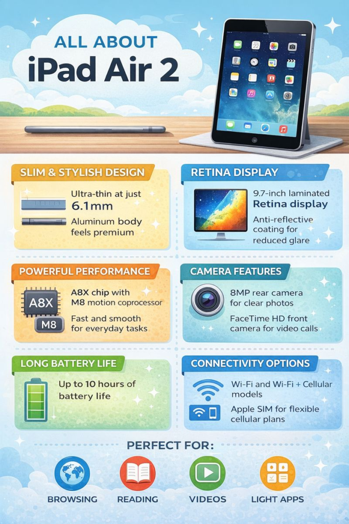 This article explores the iPad Air 2 in detail, covering its design, display, performance, battery life, camera, connectivity, and overall usability. If you are considering this tablet for basic work, study, or entertainment, this guide will help you make an informed decision.