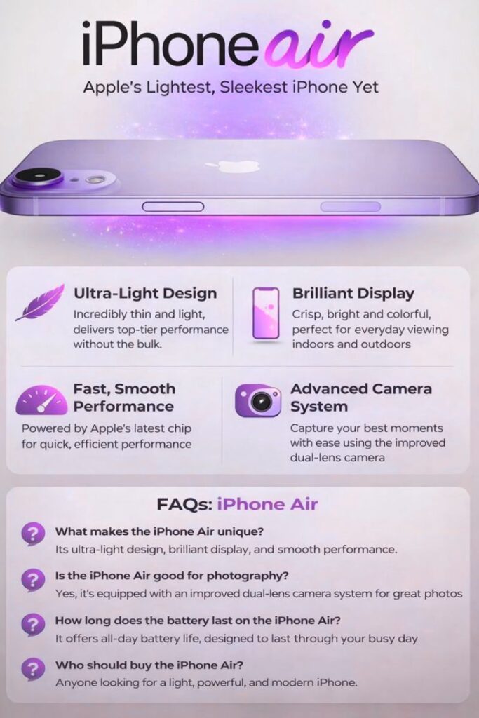 The iPhone Air is not about chasing extremes—it is about refinement. Lightweight, reliable, and thoughtfully designed, it fits naturally into everyday life. For users who value comfort, efficiency, and Apple’s trusted ecosystem, the iPhone Air stands out as a smart and sensible choice.