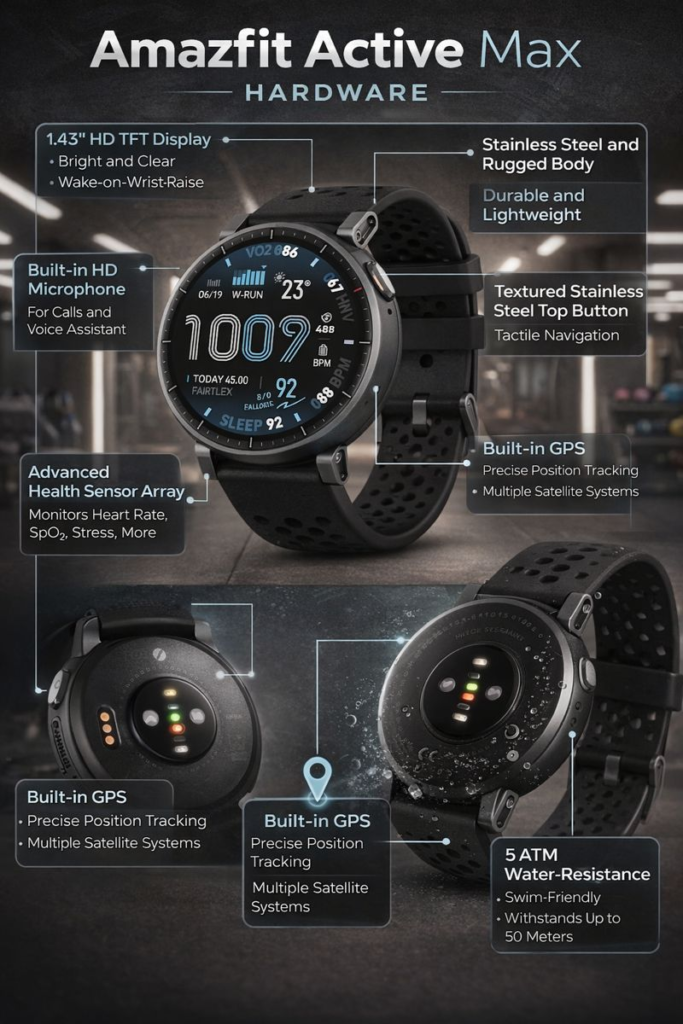 At first glance, the Amazfit Active Max stands out with a bold yet refined design. It features a rugged circular body that feels solid on the wrist while maintaining a lightweight profile suitable for all-day wear. The materials are thoughtfully chosen to handle outdoor conditions, daily workouts, and extended usage without discomfort.