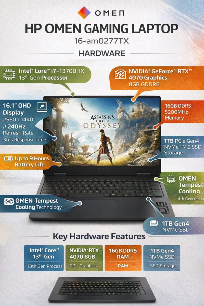 The HP OMEN Gaming Laptop 16-am0277TX is designed for users who want high-end gaming performance without sacrificing everyday usability. Rather than focusing solely on raw power, HP has crafted a machine that delivers smooth gameplay, efficient cooling, and long-term reliability.