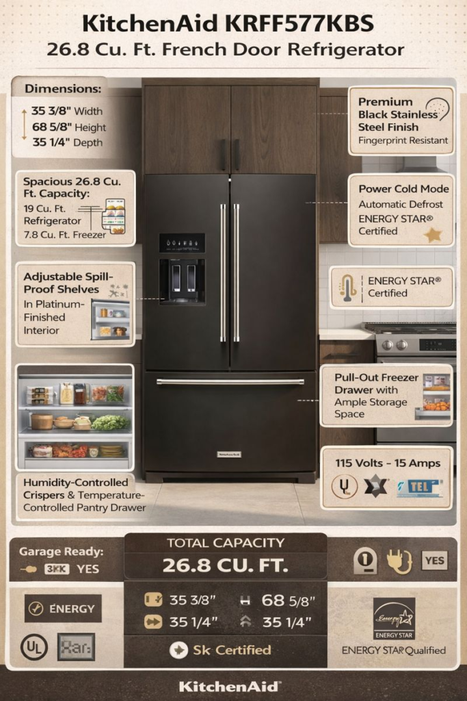 The KitchenAid KRFF577KBS is designed for households that demand both performance and refined aesthetics from their kitchen appliances. As a 26.8 cu. ft. standard-depth French door refrigerator, it targets families, cooking enthusiasts, and homeowners who want generous storage, intuitive usability, and dependable cooling without stepping into smart-appliance complexity. After evaluating its design, storage layout, cooling performance, and day-to-day practicality, it becomes clear that this model focuses on long-term reliability and thoughtful engineering rather than unnecessary gimmicks.