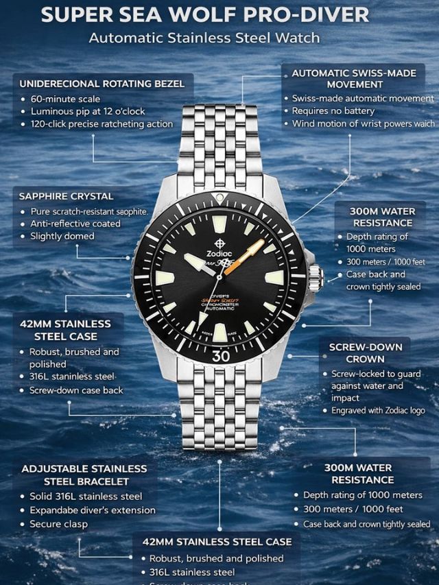 The Super Sea Wolf Pro-Diver is more than just another stainless steel dive watch. It represents a continuation of Zodiac’s long-standing relationship with underwater exploration while adapting to the expectations of today’s serious watch enthusiasts. Designed for professional-grade performance yet refined enough for everyday wear, this automatic dive watch blends engineering precision with practical aesthetics.