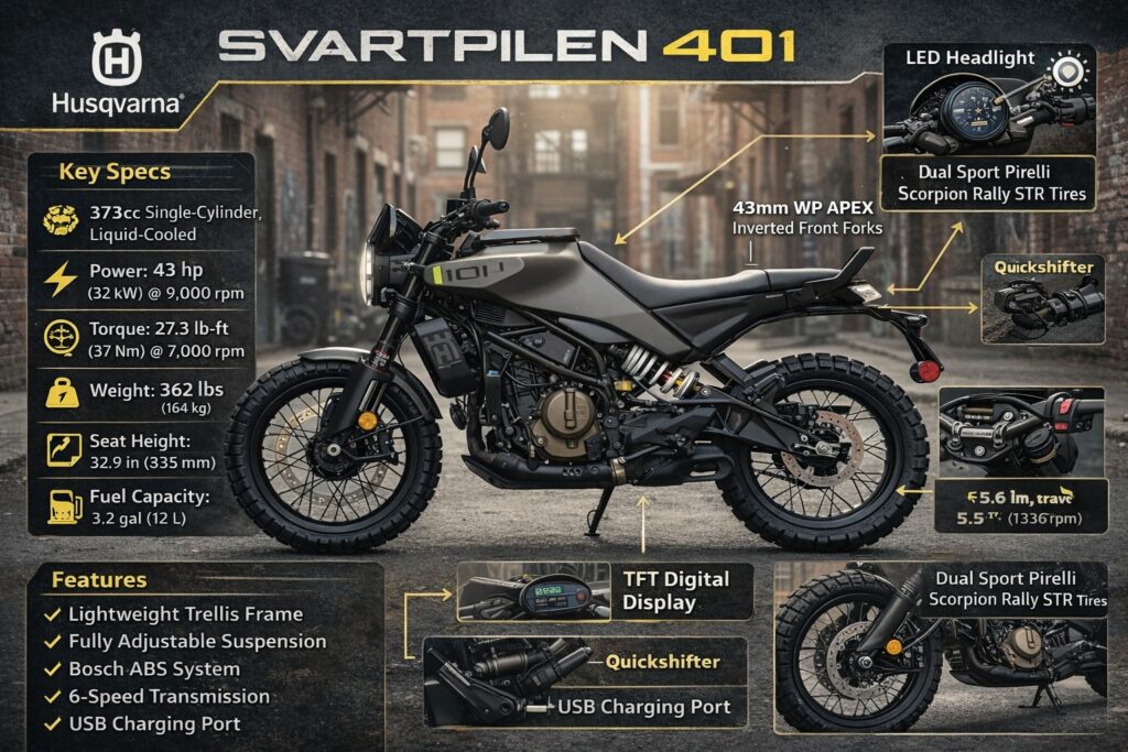 Its combination of manageable power, refined ride quality, modern tech, and distinctive styling makes Svartpilen 401 a versatile all-rounder.