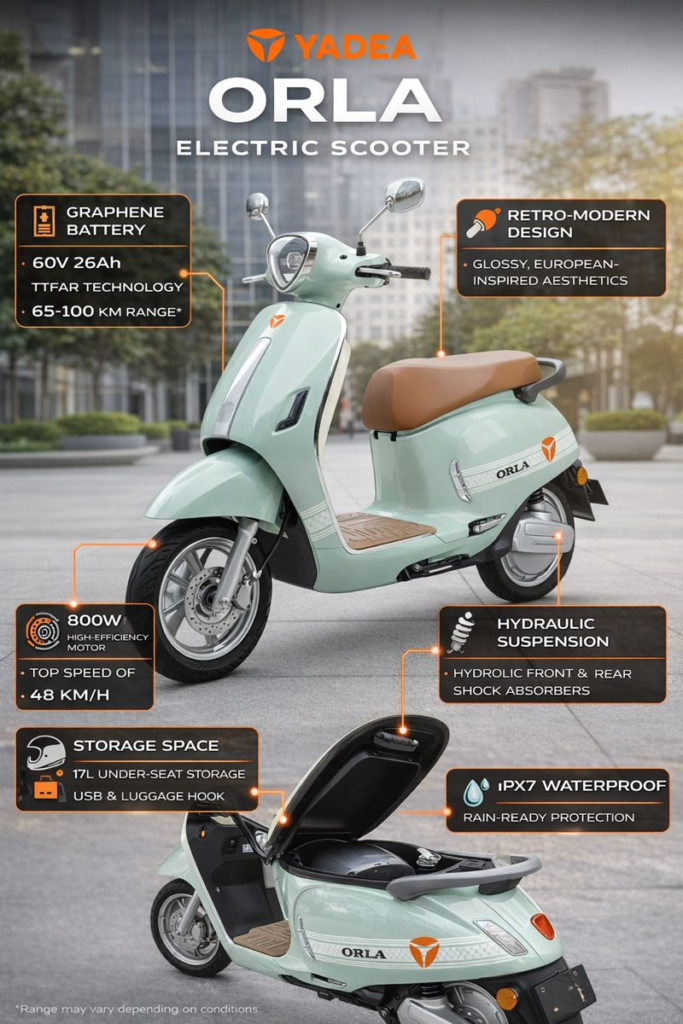 The Yadea Orla electric scooter is a well-rounded option for urban riders who want a stylish, comfortable, and reliable electric scooter. It focuses on real-world usability rather than flashy performance numbers, which makes it practical for daily commuting.